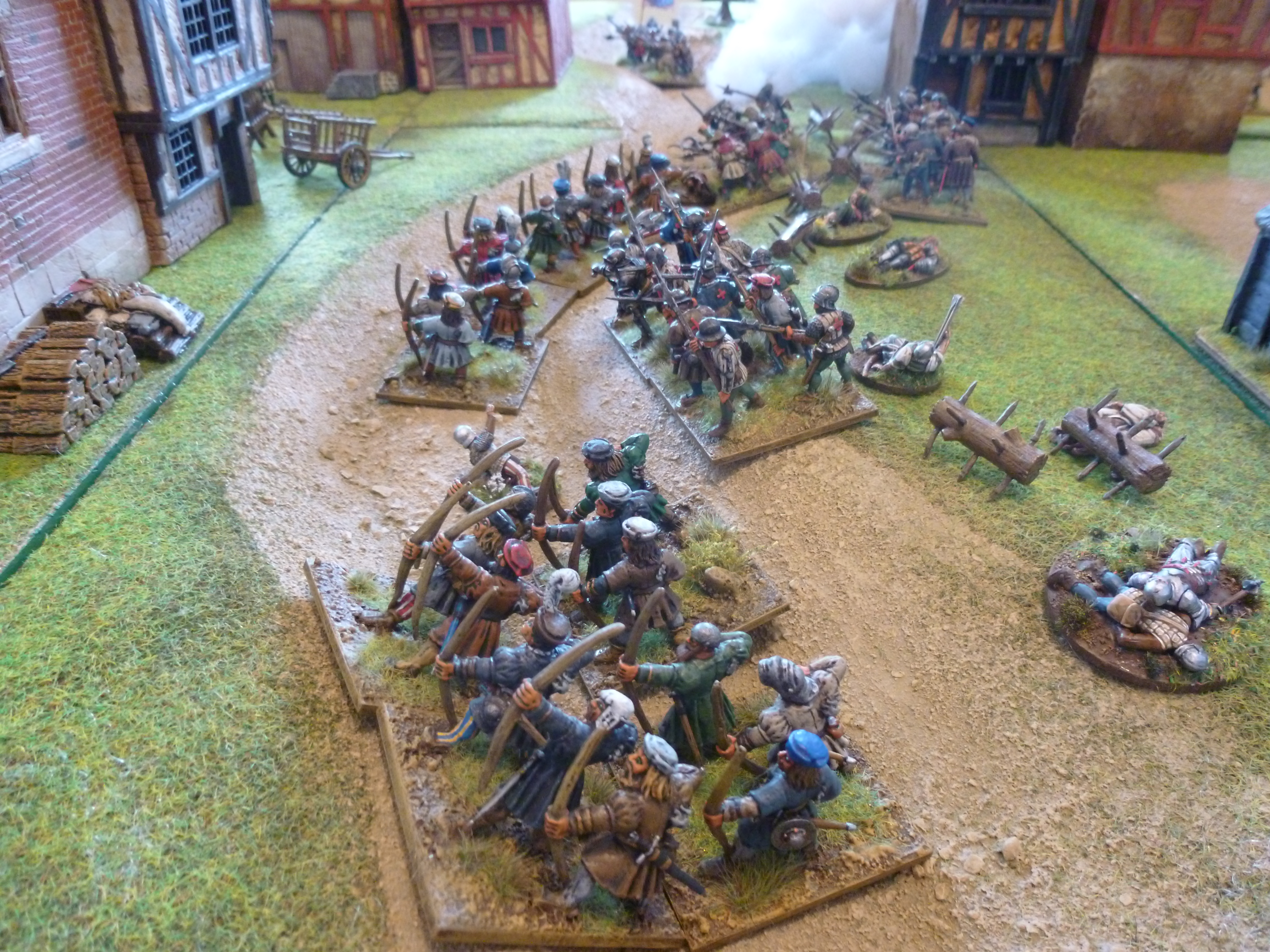 On the morning of September 18th Sir Edward Courtenay's retinue was caught off guard by the early morning attack and was still arming. To represent this from the start of turn four the Courtenay and Exeter player could roll 2D6. On the first roll (at the start of turn 4) an 11+ on 2D6 would herald the arrival of Sir Edward Courtenay's retinue. The following turn a 10+ would mean they could arrive and the following turn a 9+ and so on. Sir Edward Courtenay's retinue could only enter the table via a move activation and could not shoot, attack or skirmish when first arriving. Sir Edward Courtenay's retinue would arrive via the high street at the other end of the table (see the photo below).