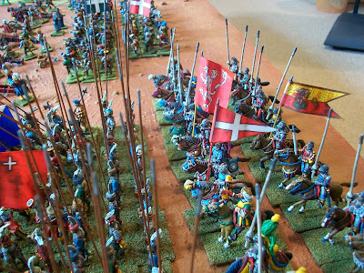 This next Swiss block shown below is even bigger than the other containing 144 Landsknechts who with a simple change of banners have become Reisläufer for the day. The yellow banner with the red cross and black eagles is that of Anne De Montmorency who along with other French noble and gentlemen dismounted and attacked the Imperial defences amongst the Swiss in order to gain honour and glory. This highlights an interesting change in the status of the infantry, probably started by Maximillian when he stood amongst his Landsknechts and shouldered a pike with them. It's hard to imagine the French High nobility doing this kind of thing before the Italian wars, although they fought on foot at times in the Hundred Years War I don't know of examples where they deliberately joined a specific infantry type in order to gain glory.