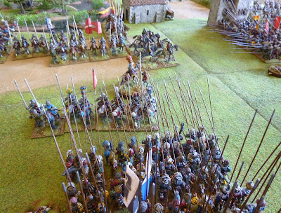 Once on the table at the start of each turn the pike blocks would always move towards, and attack if possible, the nearest enemy unit to their front, heading for the nearest large body of troops. If either of the French retinue leaders were within attacking range they would prioritise them over other units. Any contentious decisions over which unit they would attack were resolved by a dice roll. The pike were not required to take activation tests but would move every turn (unless they had less than 12 "hits" left and had failed a courage test).